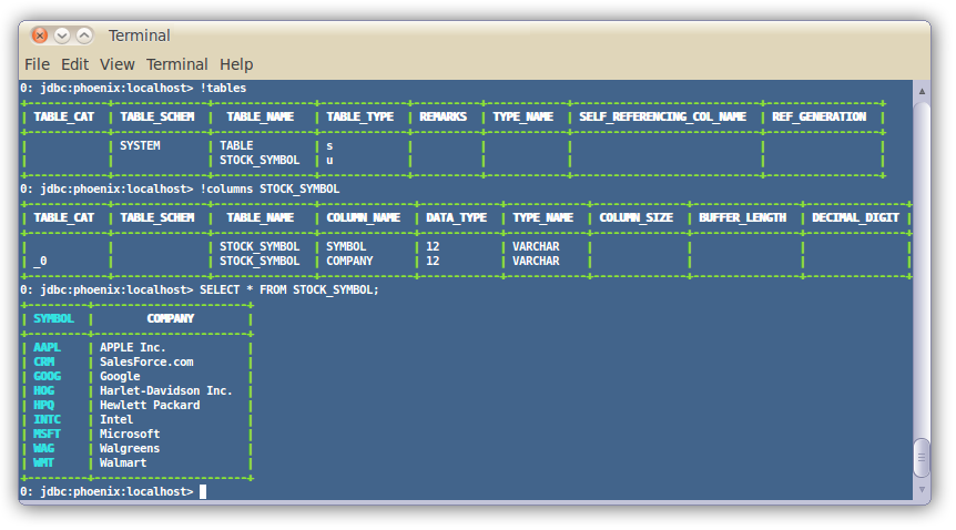 A terminal interface to execute SQL from the command line is now bundled with Phoenix. To start it, execute the following from the bin directory: